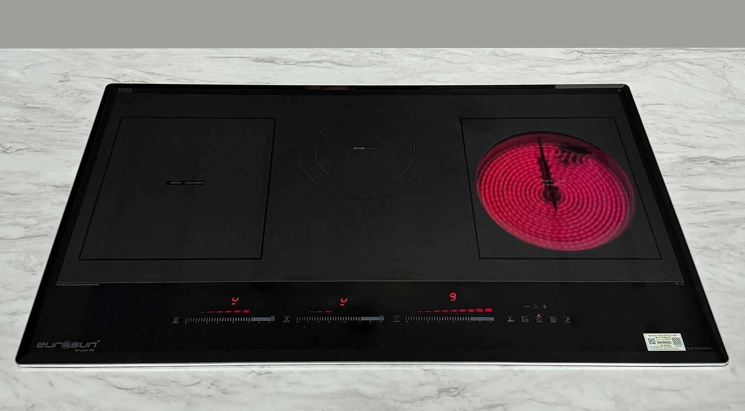 Bếp điện từ Eurosun EU-TE398Pro gồm 3 vùng nấu với tổng công suất là 5600W. Vùng nấu từ trái có công suất là 2300W khi kích hoạt tính năng nấu siêu nhanh Booster công suất lên tới 3000W. Vùng nấu từ giữa có công suất là 1300W khi kích hoạt tính năng nấu siêu nhanh Booster công suất lên tới 1600W. Vùng nấu hồng ngoại phải trang bị mâm nhiệt Hi-light 2 vòng nhiệt với công suất lần lượt là 2200W/1000W