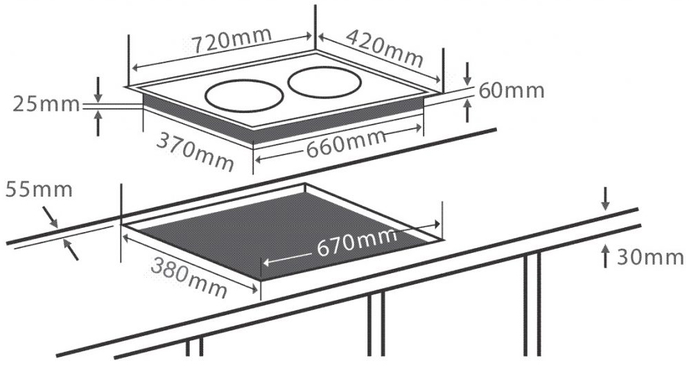- Kích thước bếp (DxRxC): 720 x 420 x 60 mm