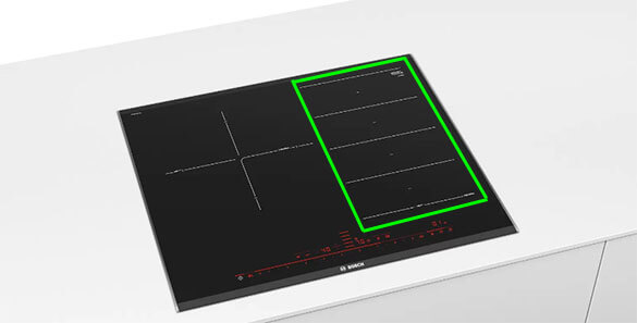 Bạn có thể sử dụng bếp từ Bosch PXJ675DC1E như một bếp từ 2 vùng nấu bình thường hoặc kết hợp thành vùng nấu lớn hơn. Vùng nấu có ưu điểm hoạt động rất linh hoạt và có thể phân chia, cộng gộp trong tích tắc.