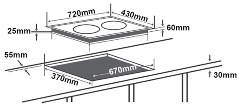 - Kích thước bếp (DxRxC): 720 x 430 x 60mm