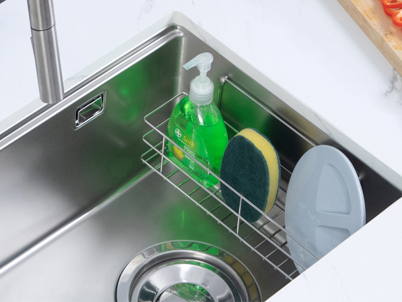 Chậu đi kèm giỏ đựng đồ inox 304, có thể linh hoạt sử dụng để đựng bọt biển, xà phòng hoặc dụng cụ rửa bát. Thiết kế giỏ đựng tiện lợi giúp không gian xung quanh bồn rửa luôn gọn gàng, sạch sẽ.