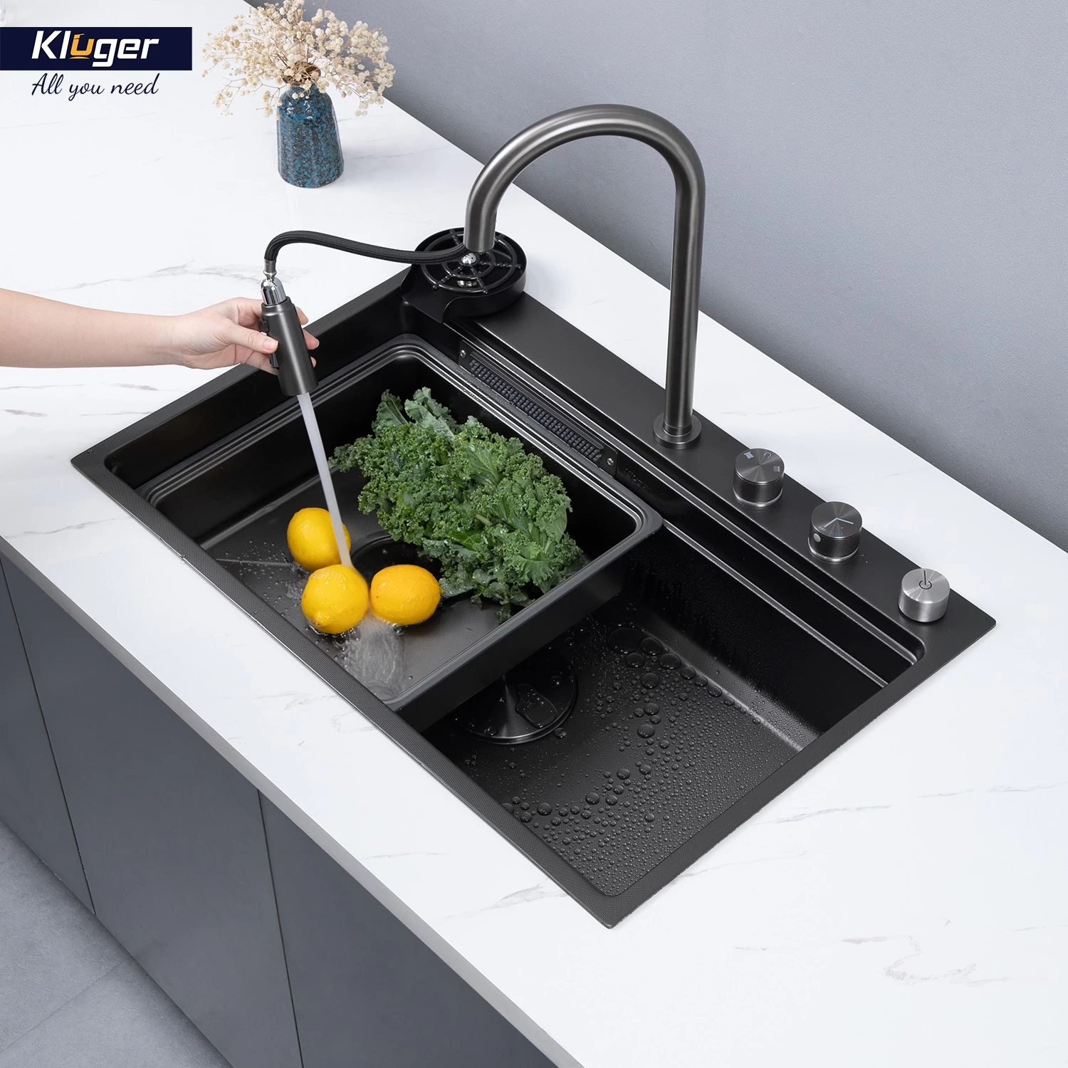 Chậu rửa tích hợp vòi rửa & thác nước cao cấp – Kluger KWF8161FB-S76W Plus – Bản đầy đủ phụ kiện bổ sung – Bề mặt LINEN màu đen – Thuộc bộ sưu tập K600 Series – Điểm nhấn độc đáo – Cảm giác tươi mát