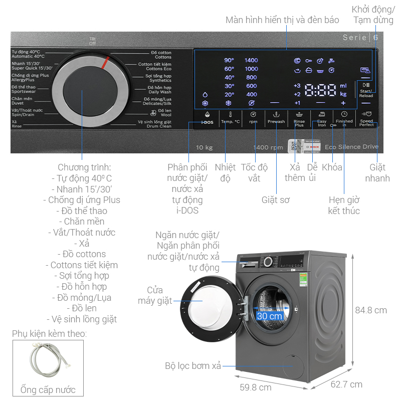 – Mẫu máy giặt Bosch này có khối lượng giặt 10 kg, đáp ứng nhu cầu sử dụng cho các hộ gia đình từ 5 – 7 người.